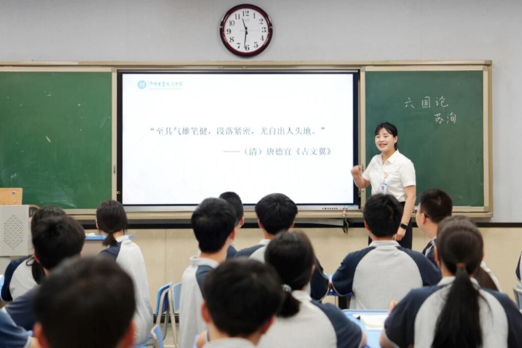 泸州老窖天府中学青年教师胡家莉通过《六国论》精读教学,展现了传统课堂的情感浸润力量。胡家莉立足文本,以清人唐德宜的“至其气雄笔健,段落紧密,尤自出人头地”为线索,通过角色朗读、小组互评,层层剖析本文谋篇布局之精巧、论证思路之严密、语言之“气雄笔健”等。学生在朗读、讨论等活动中,体会了“忧患意识”的历史穿透力,实现了情感共振。本堂课将古人智慧与当代青年的责任担当紧密联结,获评“一堂有筋骨、有温度的文化基因唤醒课”。本次活动通过“未来感”双师课与“沉浸式”传统课的对比呈现,生动诠释“教育创新不是颠覆传统,而是让科技为人文赋能”。泸州老窖天府中学将继续推进教学改革,在守正创新中探寻教育真谛。